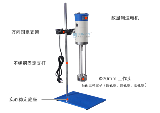 设备转速可达11000rpm,能够快速的将粉料/液料均匀分散到液料里面;转定子加工精度高、间隙小,物料由于受到极高的剪切力,分散均匀,形成很好的悬浮效果。