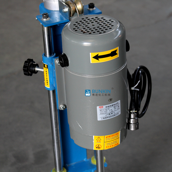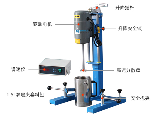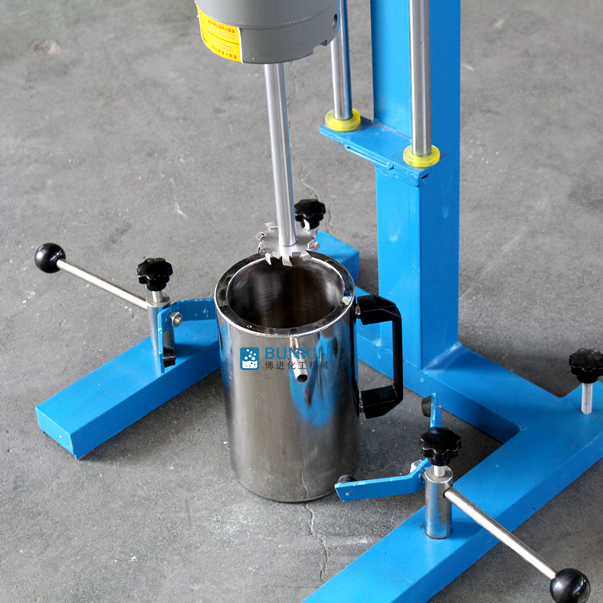 设备带有锁紧及升降手柄,能够快速升降和固定;分散盘采用内六角螺栓与主轴固定,能够方便快速拆卸更换,清洗容易;带有夹桶装置,可以快速将搅拌桶固定,防止桶在工作中发生位移造成安全事故。