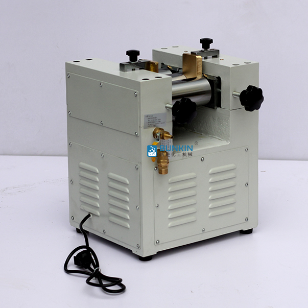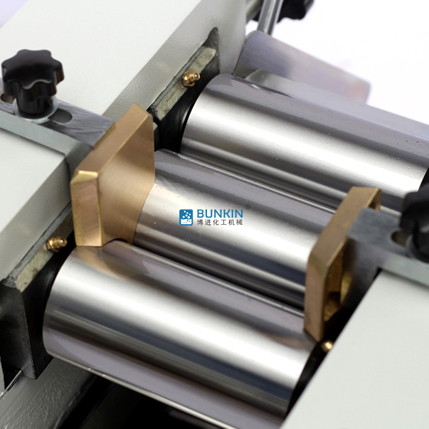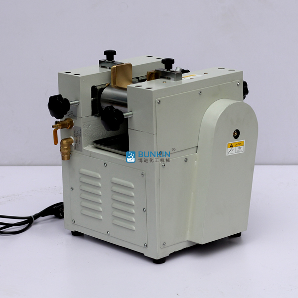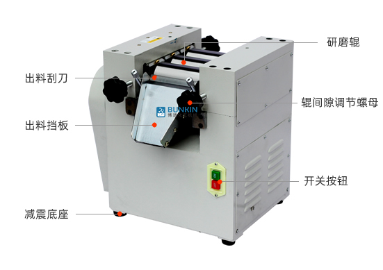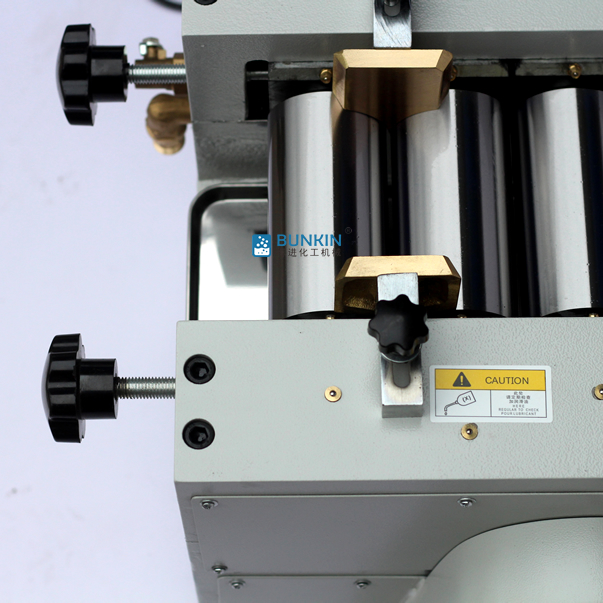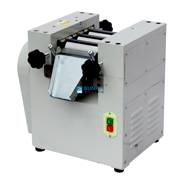 实验室三辊研磨机由三个辊筒组成,装在一个机架上,由电动机直接带动。一般辊筒间的转动方向不同,前辊向前转动,中辊向后转动。辊子转速前辊快、后辊慢。中间辊固定,前后两辊装在滑道上,有弹簧装置,用手轮调节前后辊与中辊的距离。物料由后辊与中辊之间进入,受到辊筒的挤压,产品颗粒变细,然后由快辊带出,快辊末端装有刮刀,使物料与辊筒分离,落入收集桶内。