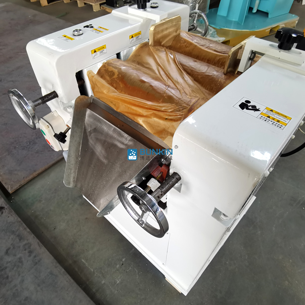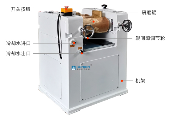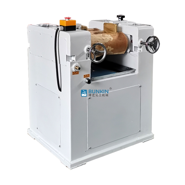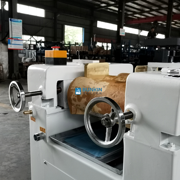 三辊研磨机由三个辊筒组成,装在一个机架上,由电动机直接带动。一般辊筒间的转动方向不同,前辊向前转动,中辊向后转动。辊子转速前辊快、后辊慢。中间辊固定,前后两辊装在滑道上,有弹簧装置,用手轮调节前后辊与中辊的距离。物料由后辊与中辊之间进入,受到辊筒的挤压,产品颗粒变细,然后由快辊带出,快辊末端装有刮刀,使物料与辊筒分离,落入收集桶内。