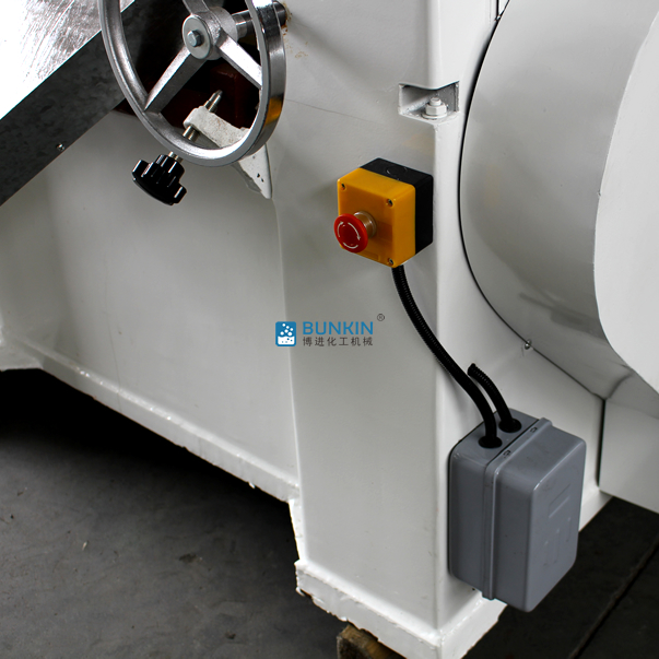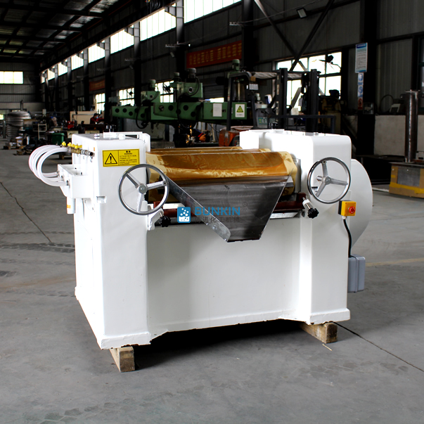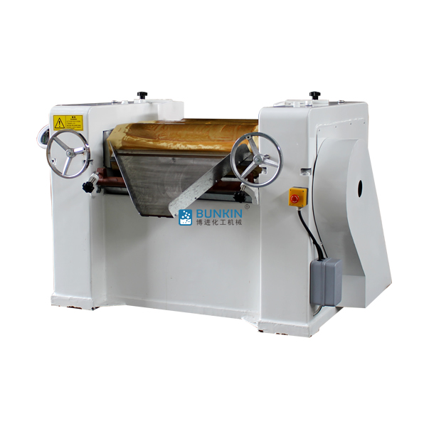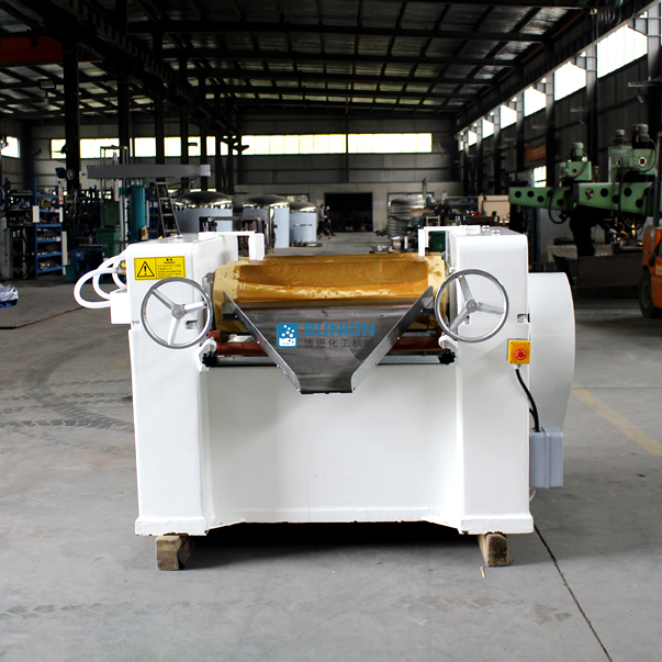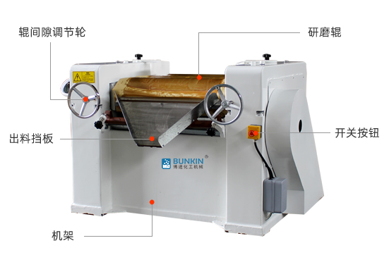 三辊研磨机由三个辊筒组成,装在一个机架上,由电动机直接带动。一般辊筒间的转动方向不同,前辊向前转动,中辊向后转动。辊子转速前辊快、后辊慢。中间辊固定,前后两辊装在滑道上,有弹簧装置,用手轮调节前后辊与中辊的距离。物料由后辊与中辊之间进入,受到辊筒的挤压,产品颗粒变细,然后由快辊带出,快辊末端装有刮刀,使物料与辊筒分离,落入收集桶内。