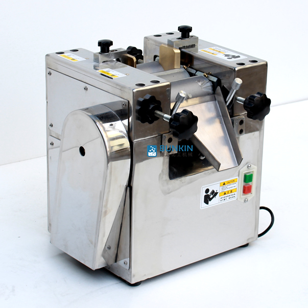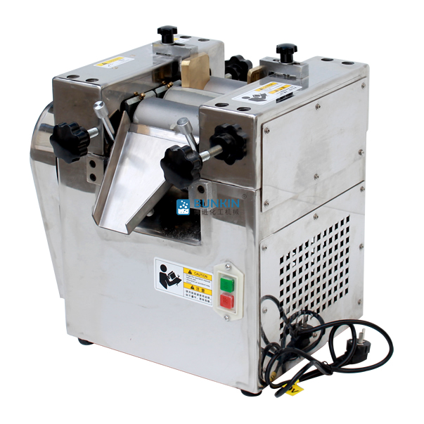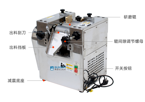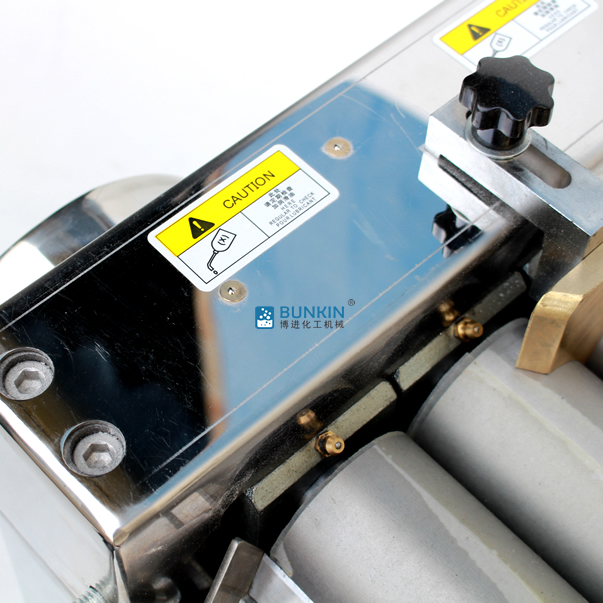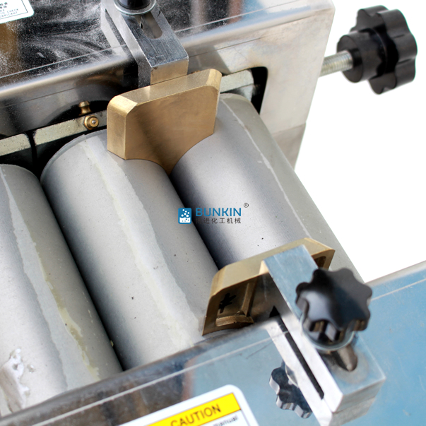 实验室三辊研磨机由三个辊筒组成,装在一个机架上,由电动机直接带动。一般辊筒间的转动方向不同,前辊向前转动,中辊向后转动。辊子转速前辊快、后辊慢。中间辊固定,前后两辊装在滑道上,有弹簧装置,用手轮调节前后辊与中辊的距离。物料由后辊与中辊之间进入,受到辊筒的挤压,产品颗粒变细,然后由快辊带出,快辊末端装有刮刀,使物料与辊筒分离,落入收集桶内。