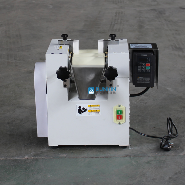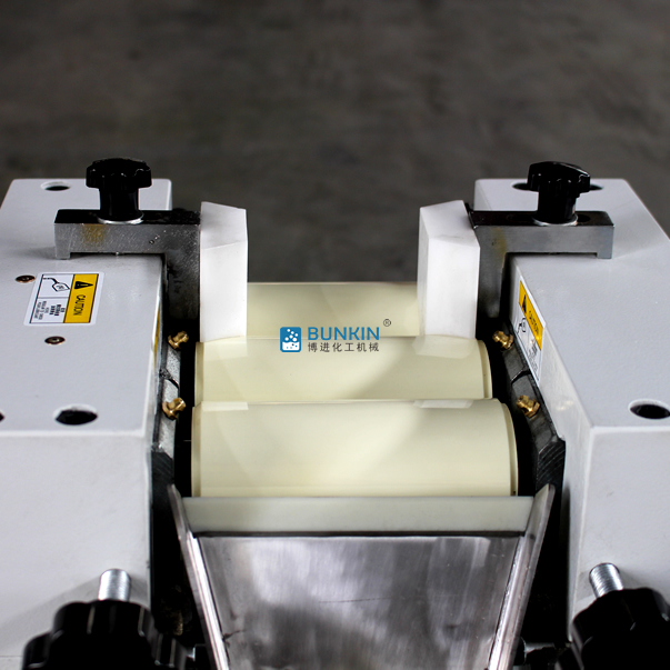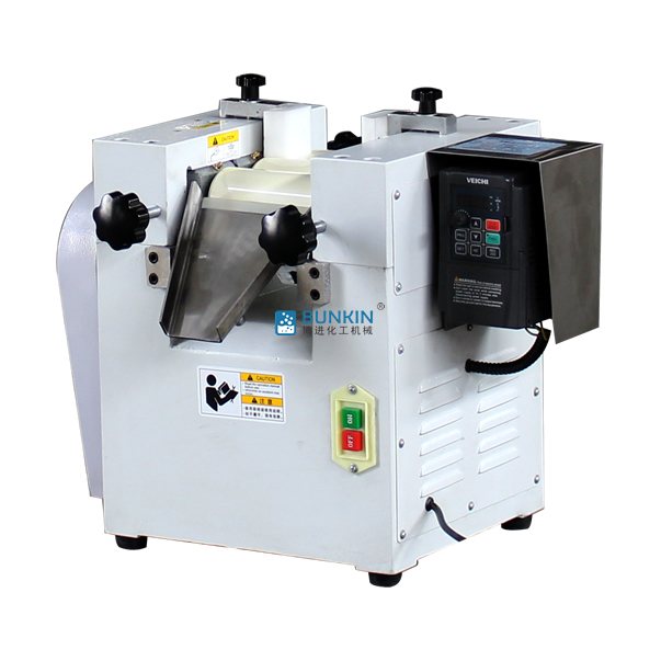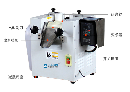 实验室三辊研磨机由三个辊筒组成,装在一个机架上,由电动机直接带动。一般辊筒间的转动方向不同,前辊向前转动,中辊向后转动。辊子转速前辊快、后辊慢。中间辊固定,前后两辊装在滑道上,有弹簧装置,用手轮调节前后辊与中辊的距离。物料由后辊与中辊之间进入,受到辊筒的挤压,产品颗粒变细,然后由快辊带出,快辊末端装有刮刀,使物料与辊筒分离,落入收集桶内。