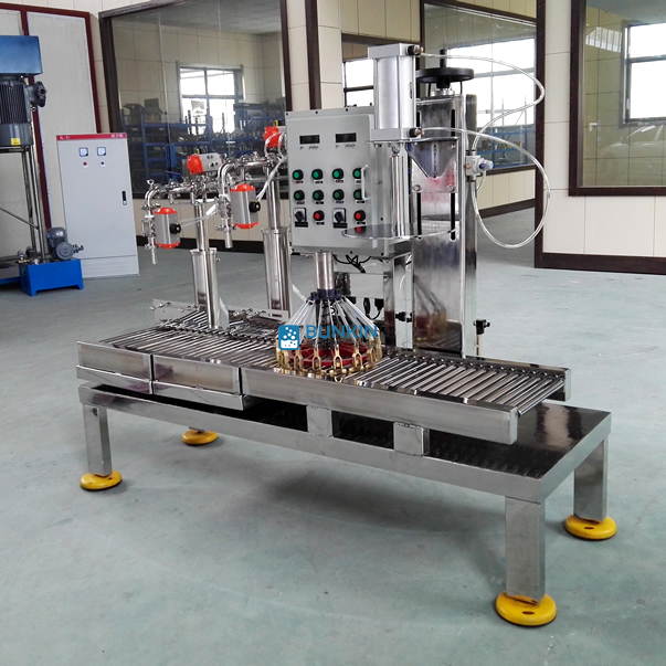 双头半自动灌装机自动化控制仪表接收称重传感器给出的重量信号,单头/大流量/小流量控制进料阀,实现自动灌装的目的;并配有半自动输送辊道及压盖/夹盖/装置,完成物料灌装与密封过程。