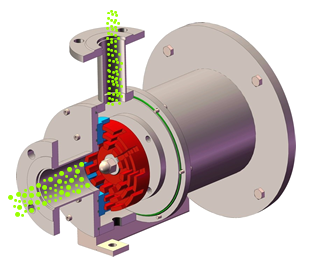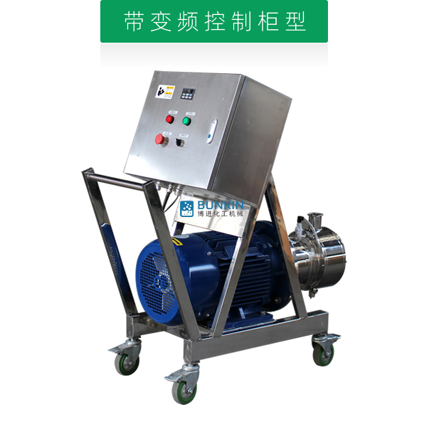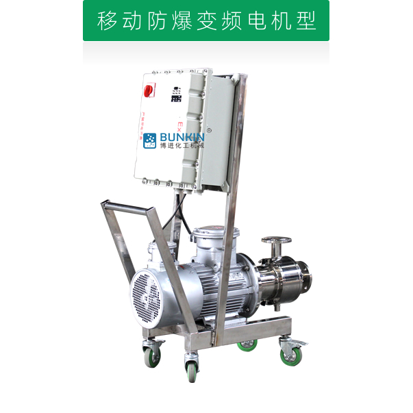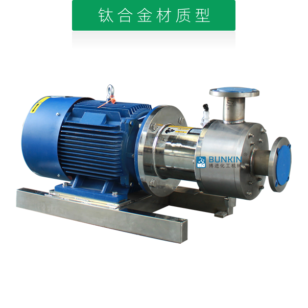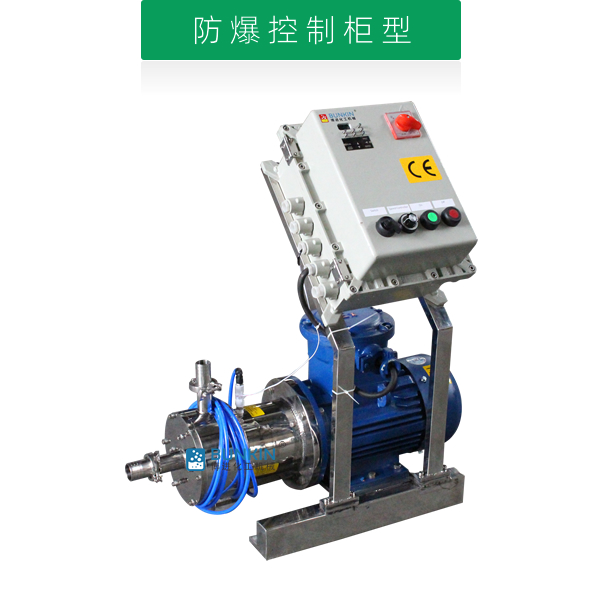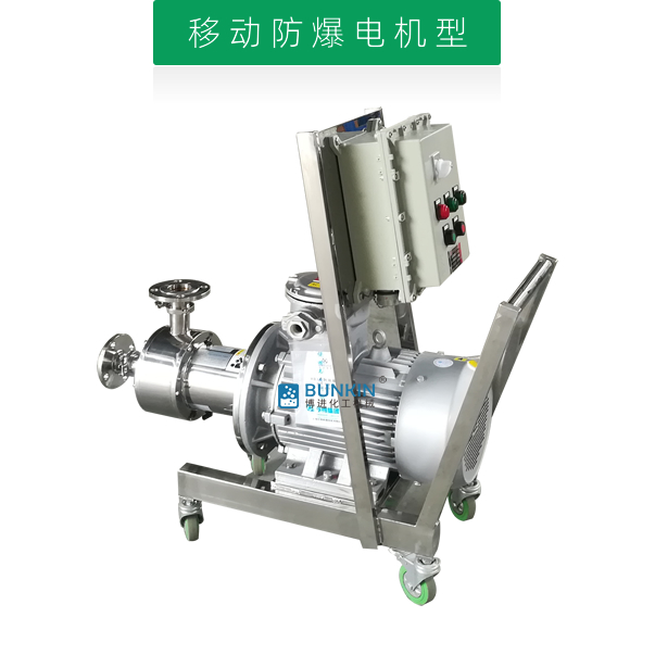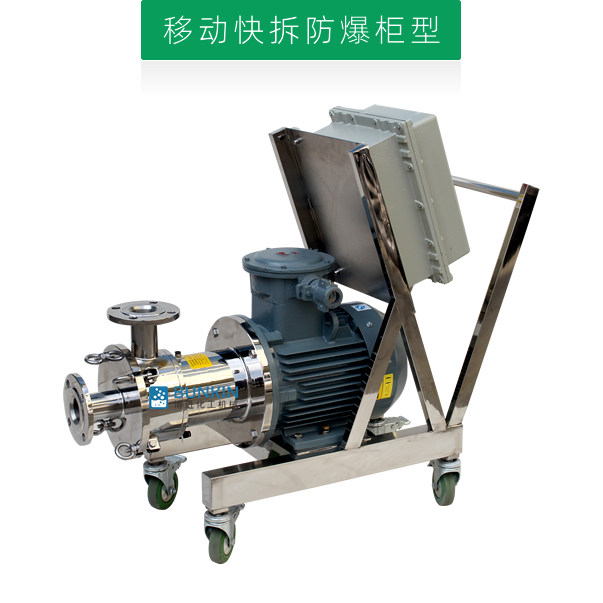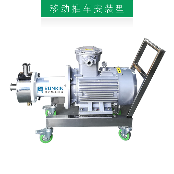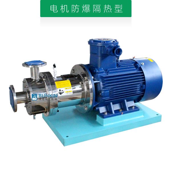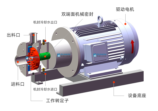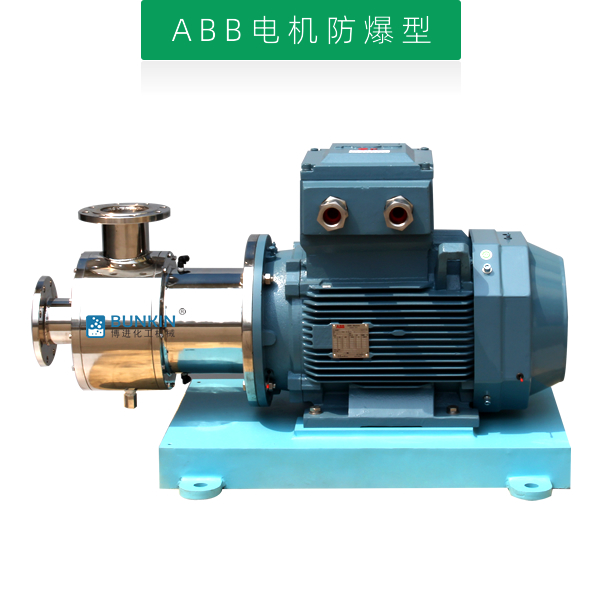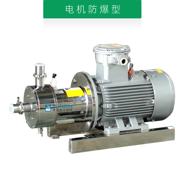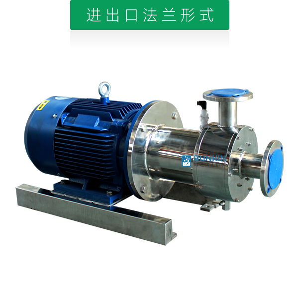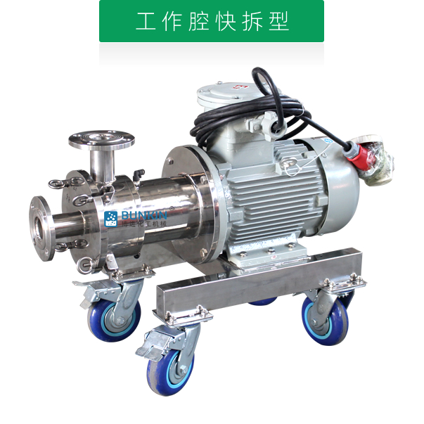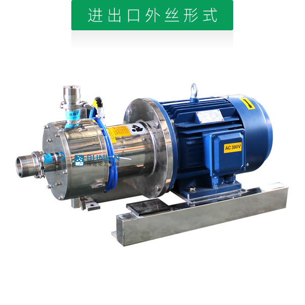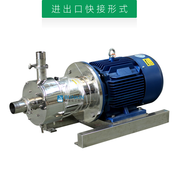 单级乳化泵采用卧式结构。在狭长的工作腔内装有一组转定子,转定子可设计成单级两层或者单级六层结构,转定子对偶耦合。由电机带动中间轴进行高速运转,转定子形成真空,物料从进口被吸入转定子腔内,强大动能使转子产生极高的线速度,使物料在转、定子间隙之间经过强烈的撞击、破碎、离心挤、液层摩擦、强力剪切之后飞射出去,在多种不同方向力的作用下,产生强大紊流,物料从出口流出。并可根据工艺要求进行多次循环处理。