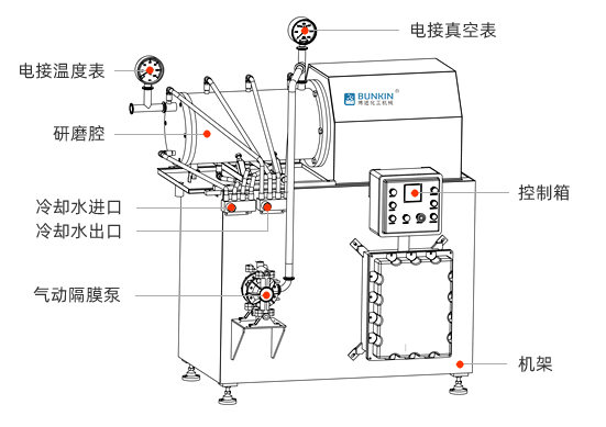 研磨腔外带特制冷却水夹套,在设备运行时通水冷却,起到很好的冷却效果,常规温升小于10º,设备带有温度和压力监控,能够设定“保护值”,确保产品品质。