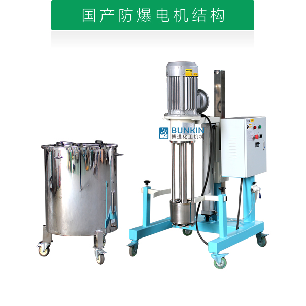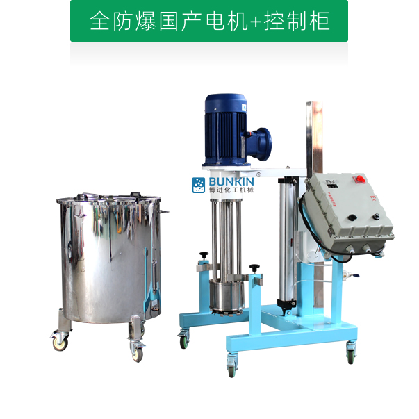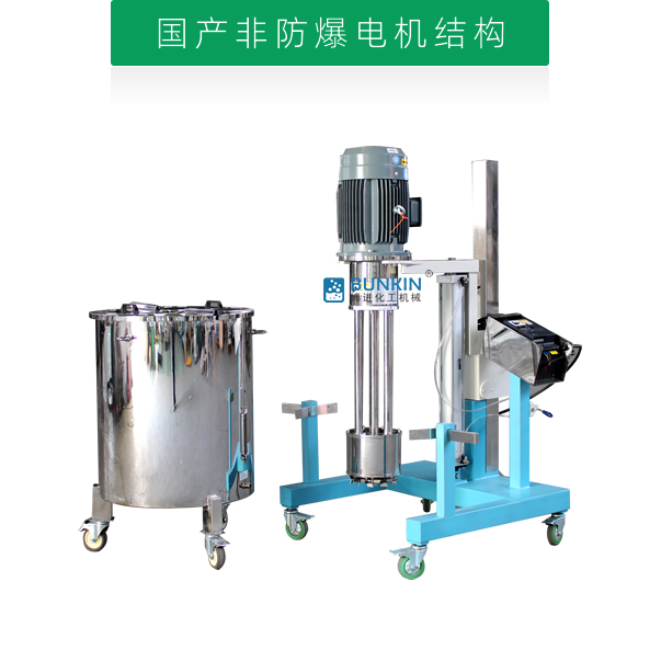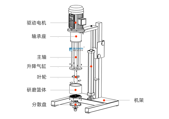 气动升降篮式研磨机电机运转带动拨杆和底部分散盘高速旋转,使分散盘上部及篮腔内部形成真空,浆料被吸入篮式研磨腔内。拨杆驱动腔内的研磨介质产生向各个方向的力,物料中的颗粒受到介质不断地碰撞及摩擦,粒径变小,粒径范围变窄;分散盘的高速运转,产生涡流将腔内物料抽吸出来,再循环至进料,具有非常显著的分散研磨混合效果, 通过气阀旋转或电磁阀点动控制实现气缸工作,利用气缸升降带动电机及工作头升降。