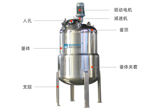 3、不锈钢搅拌罐盖上部配置有传动装置(电机或减速器),由传动轴驱动搅拌罐内的搅拌器。