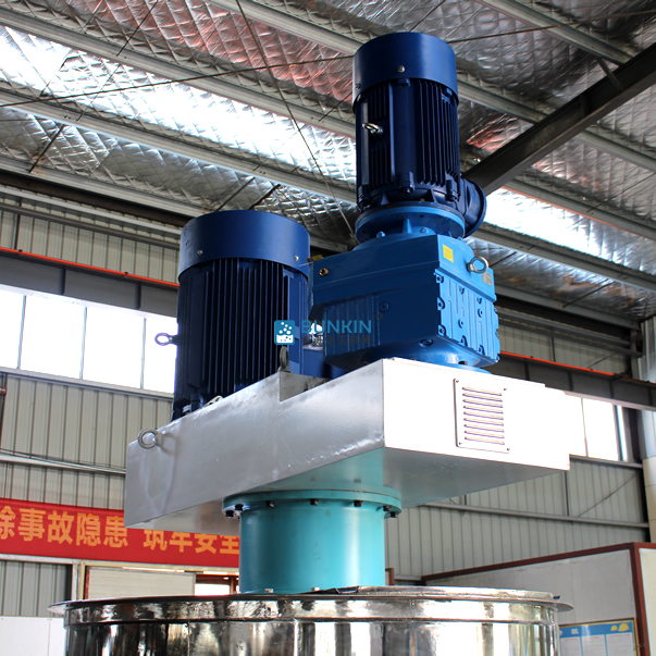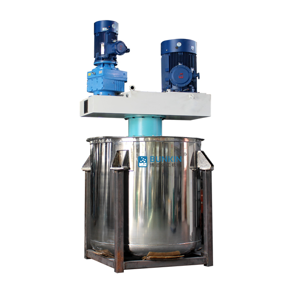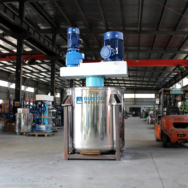 同心双轴分散搅拌釜搅拌浆叶在动力机组的驱动下,沿固定方向旋转;在旋转过程中,驱使物料做轴向旋转和径向旋转。搅拌机内的物料,同时存在轴向运动和圆周运动,因而同时存在剪切搅拌和扩散搅拌等几种搅拌形式。在搅拌桨上装有刮刀,紧贴桶壁刮拭,刮刀随着搅拌器旋转时把桶壁的物料完全刮掉,使桶壁无滞留料,同时提高混合效果。分散盘通过高速运转,使物料呈环状流,产生强旋涡,呈螺旋状下降到涡流底部。粒子间产生强烈的剪切撞击与磨擦,达到迅速分散、溶解功能。搅拌盘通过圆周运动,产生较好的径向作用里,加速物料循环,提高分散效率。