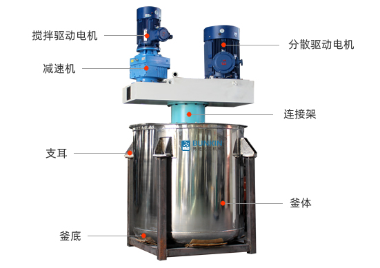 同心双轴分散搅拌釜由带刮壁式搅拌器和高速分散器组成,两组搅拌器同时作业使物料受到强烈的分散、混合作用,达到快速混合的目的;搅拌器一般分为锚式和蝶式两种,针对不同粘度、比重的物料和不同的生产工艺要求可以设计较好搅拌形式。