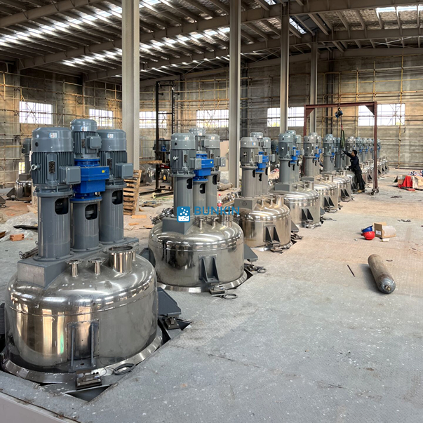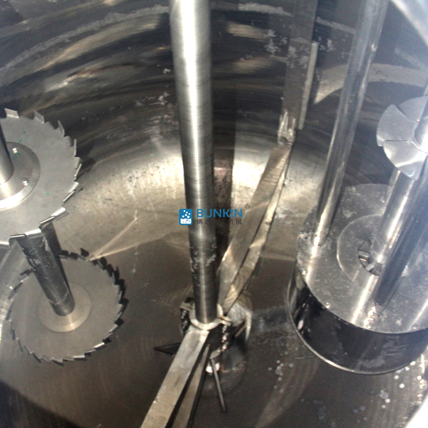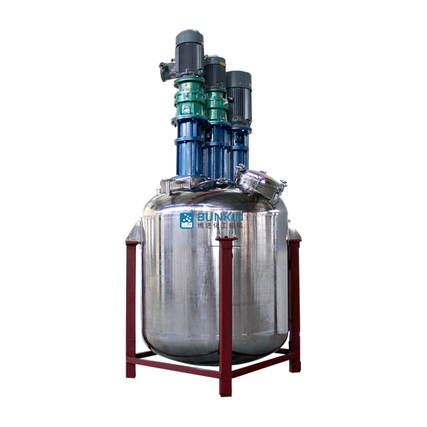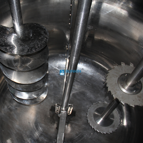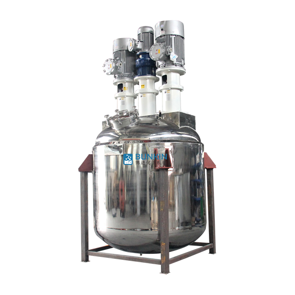 三轴多功能反应釜由带刮壁式搅拌器和高速分散器(乳化头或研磨头)组成,三组搅拌器同时作业使物料受到强烈的分散、混合作用,达到快速混合的目的;搅拌器一般分为锚式和蝶式两种,针对不同粘度、比重的物料和不同的生产工艺要求可以设计较好搅拌形式。
