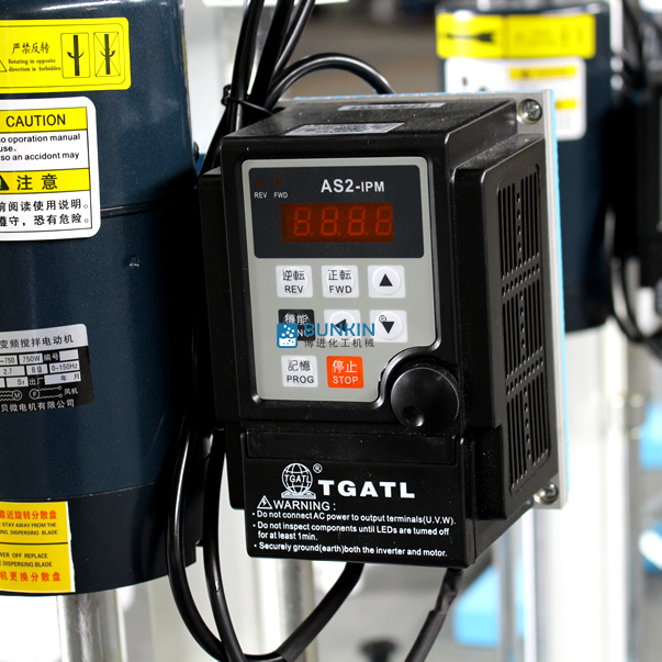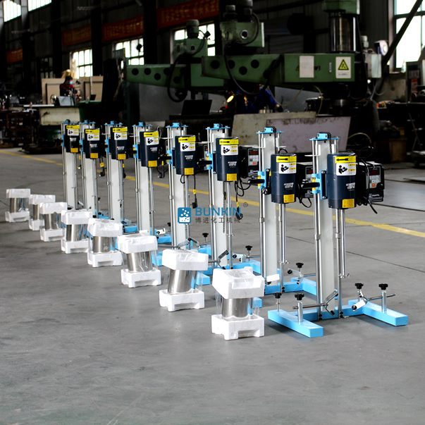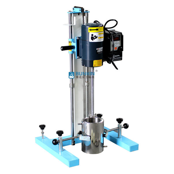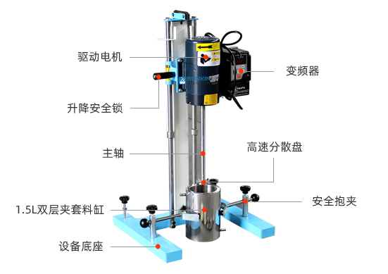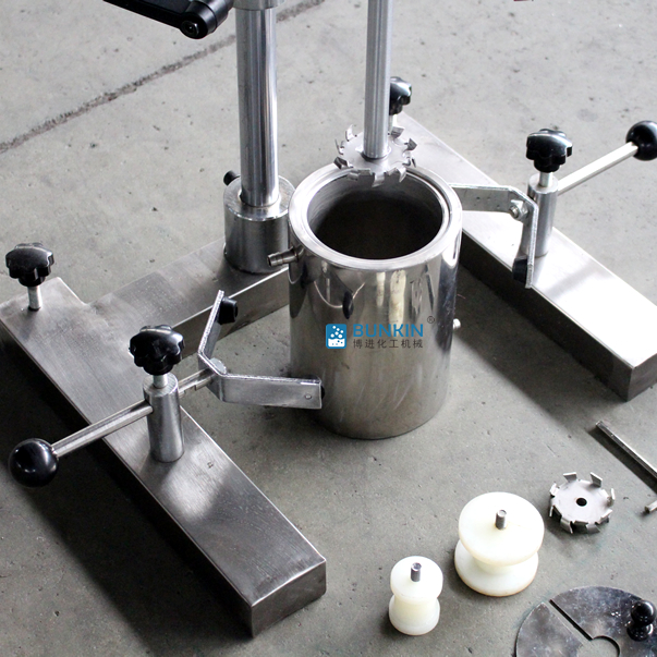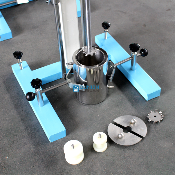 设备带有锁紧及升降手柄,能够快速升降和固定;分散盘采用内六角螺栓与主轴固定,能够方便快速拆卸更换,清洗容易;带有夹桶装置,可以快速将搅拌桶固定,防止桶在工作中发生位移造成安全事故。
