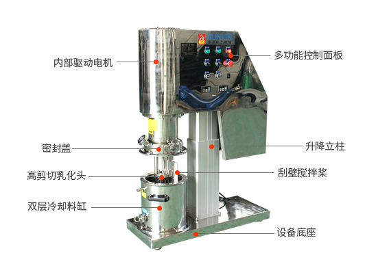 转定子采用锻件材料、CNC数控加工中心加工,转定子间隙小,剪切细度好,乳化分散效率高,选配冷却双层料筒,设备可长时间运行升温低,并可以根据工艺定时乳化时长自动停机设置。